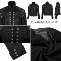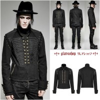 スチームパンクと異素材を融合させたデニムジャケットです。ナポレオン風の軍服ミリタリースタイルでありながら、黒いカラーリングがメンズらしい格好良さを演出しています。このジャケットは、ゴシックやパンクロック、サイバーパンク、ヴィジュアル系、V系などのファッションスタイルにもぴったりです。