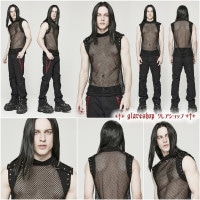 ゴスロリやパンク、サイバーパンクなどのテーマにぴったりのノースリーブベストです。メッシュとデニム生地の組み合わせが特徴で、襟と肩と袖口にデニムを使用したデザインがスタイリッシュさを引き立てます。全体的にはシースルーメッシュが使われており、セクシーなパンク感を演出します。