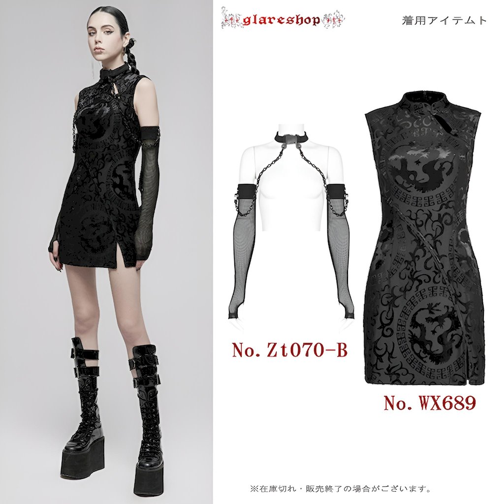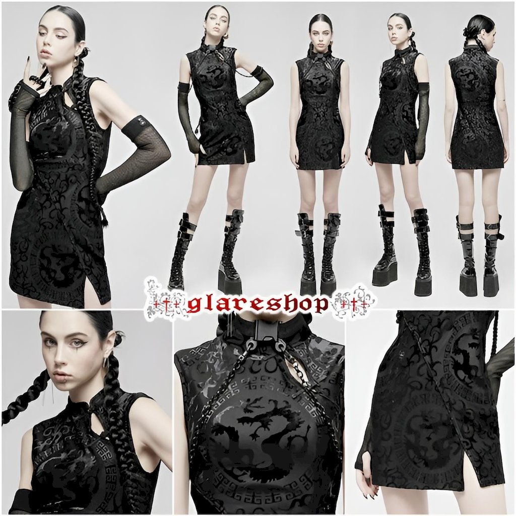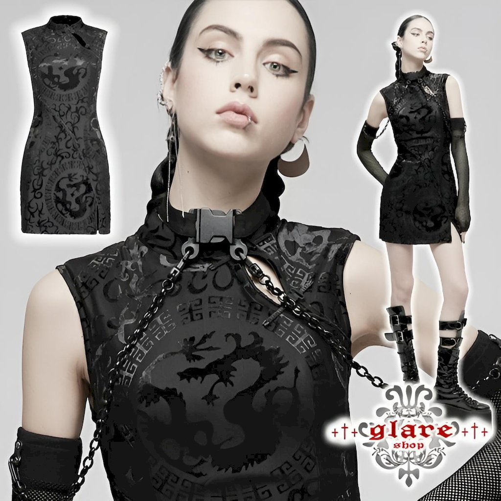 glareshopグレアショップ「XS-4XL」WX689-B■ゴシックシックドラゴン柄模様チャイナドレスミニドレス黒レディース|ゴスロリヴィジュアル系コスプレステージ衣装服[PUNKRAVE]GothicChineseStyleDragonPatternSleevelessSexyShortDress
