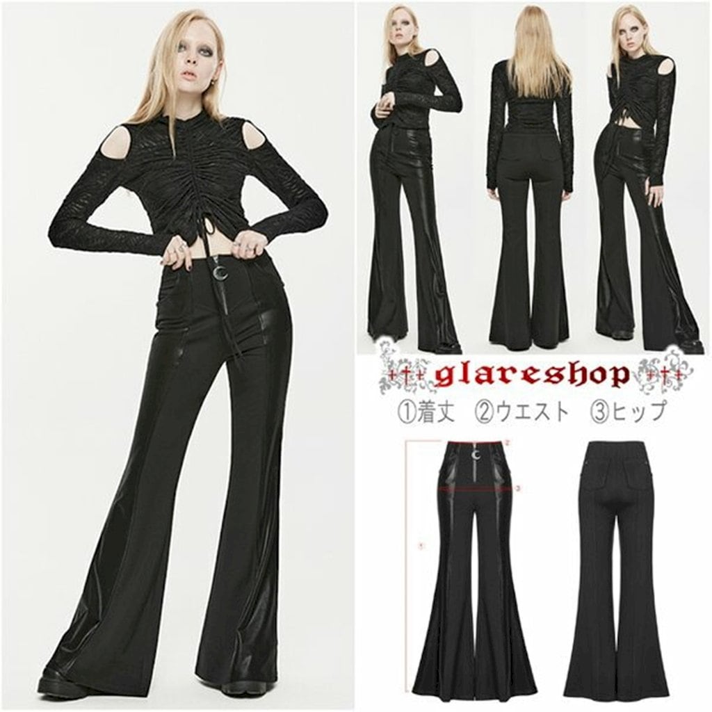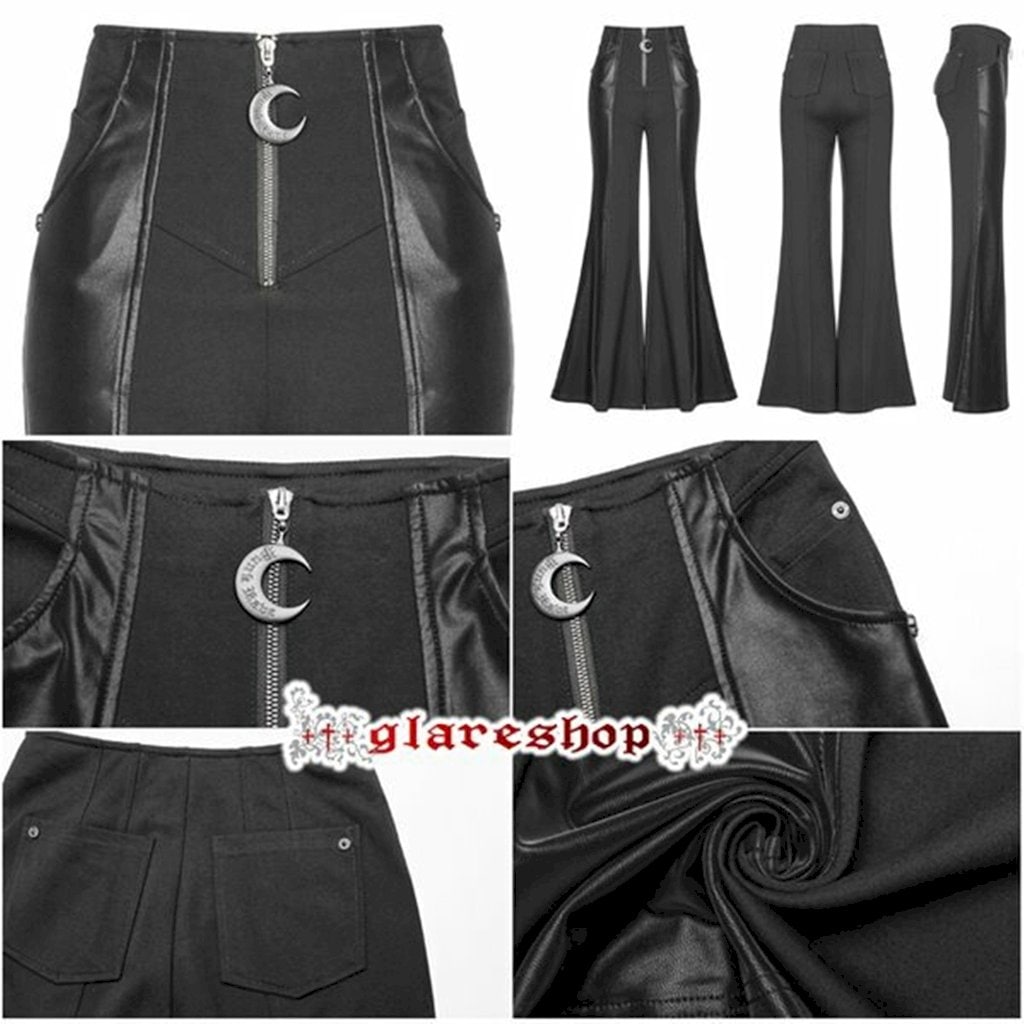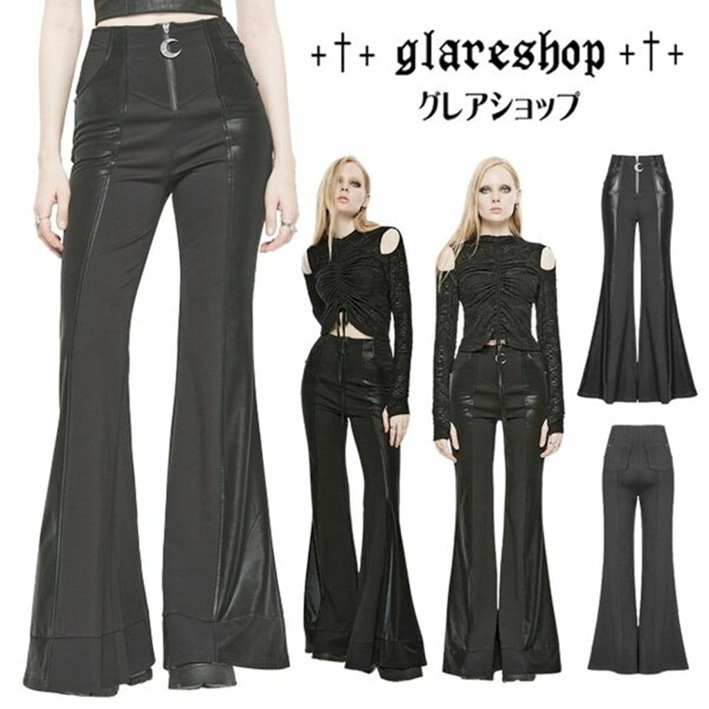 glareshop グレアショップ「XS-4XL」PX633-B■ゴスロリ パンク 異素材 フェイクレザー切替 ムーンチャーム フレアパンツ 黒 レディース | ヴィジュアル系 V系 モード系 コスプレ ステージ 衣装 服 [PUNK RAVE] Gothic Spliced Faux Leather Long Flared Pants