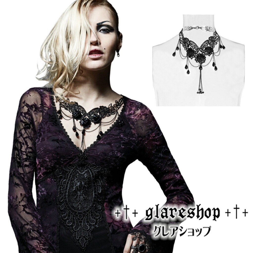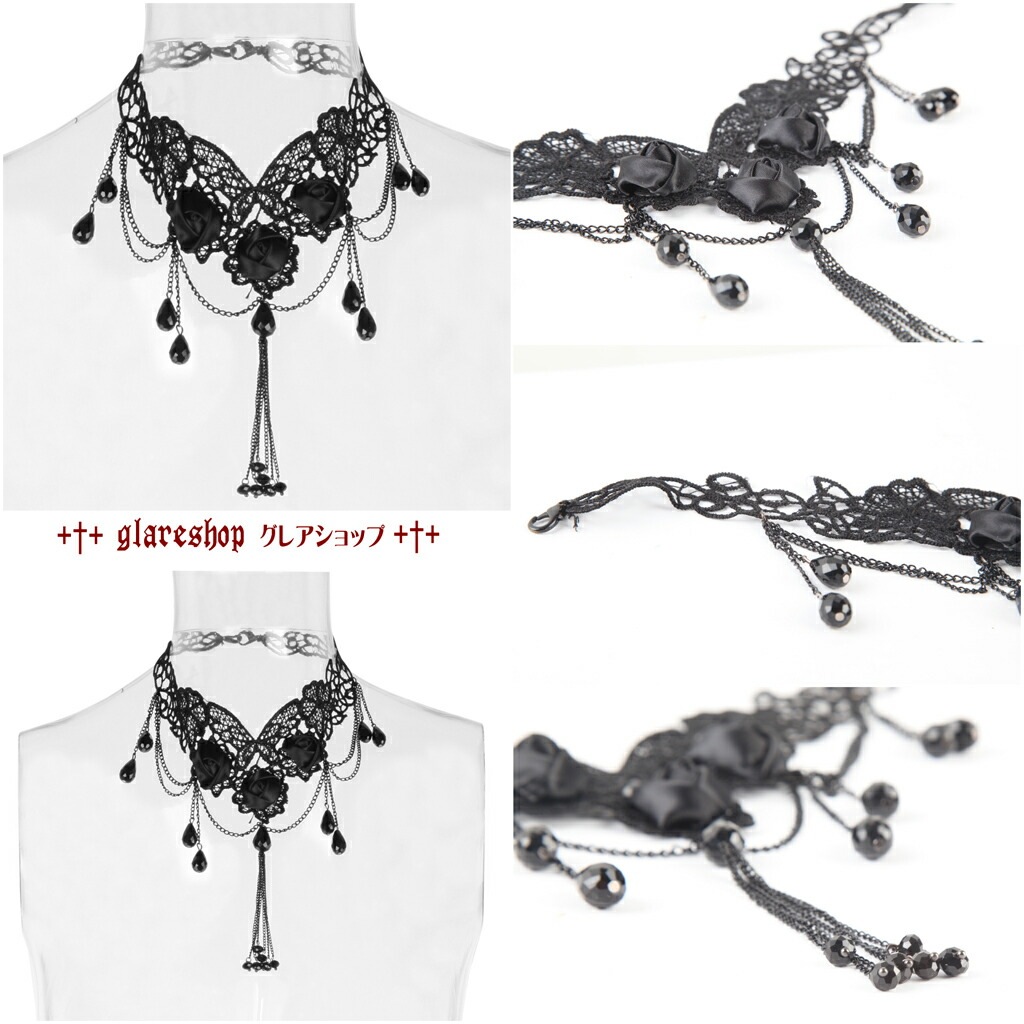 - glareshop グレアショップ「F」Zn042-B■ゴスロリ ゴシックフラワー刺繍ネックレス 黒 レディース | 地雷系 ヴィジュアル系 V系 モード系 コスプレ ステージ 衣装 服 [PUNK RAVE] Gothic Flower Teardrop Beading & Embroidery Necklace
