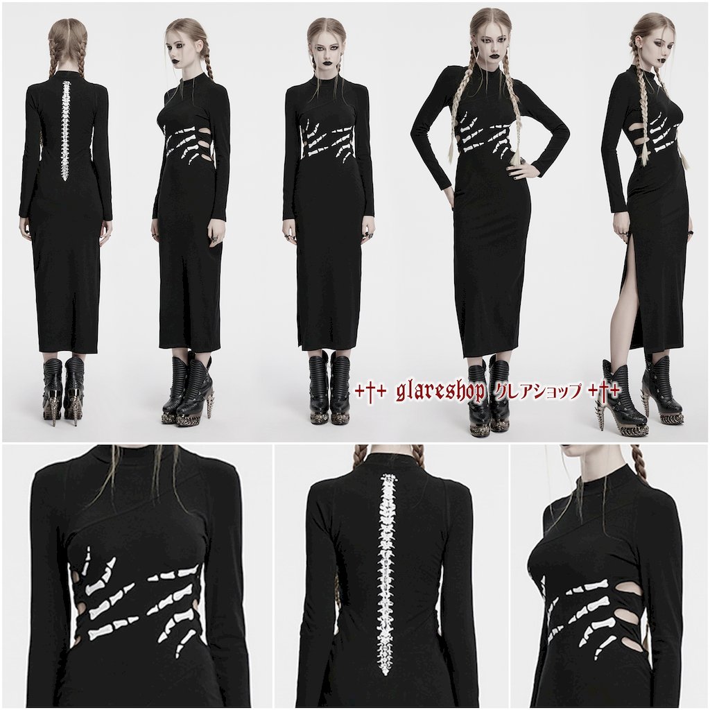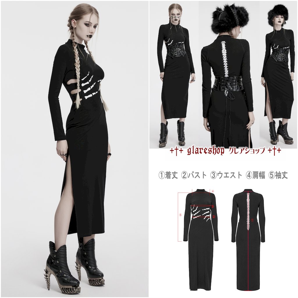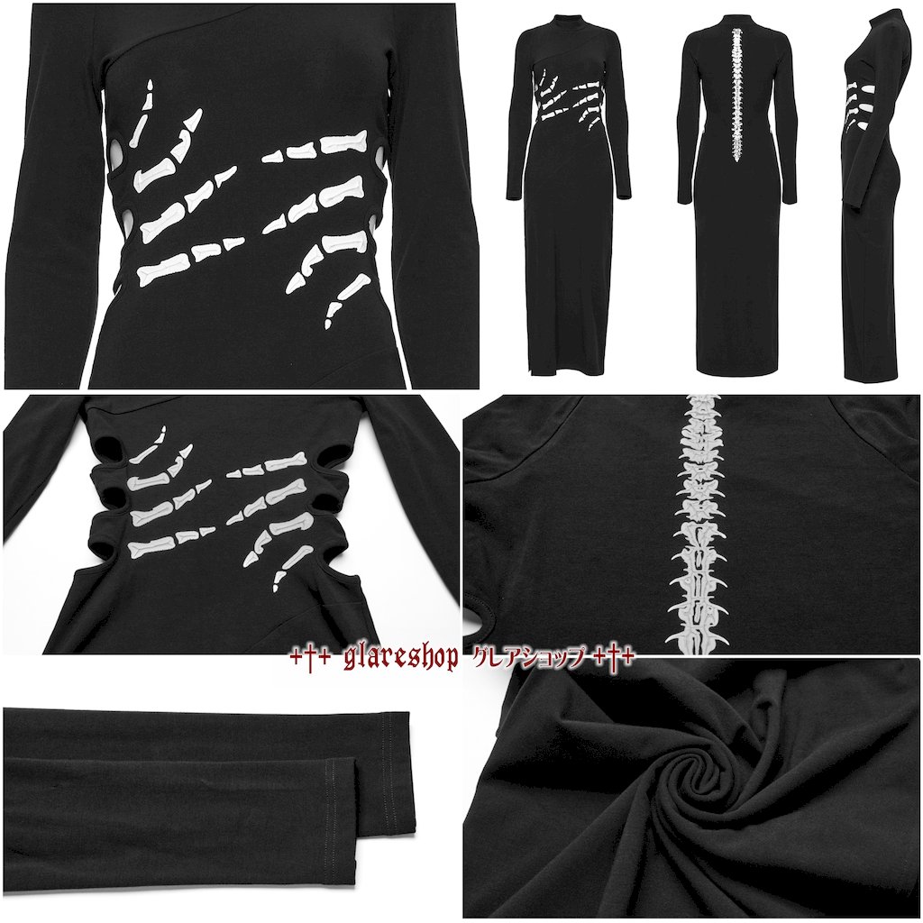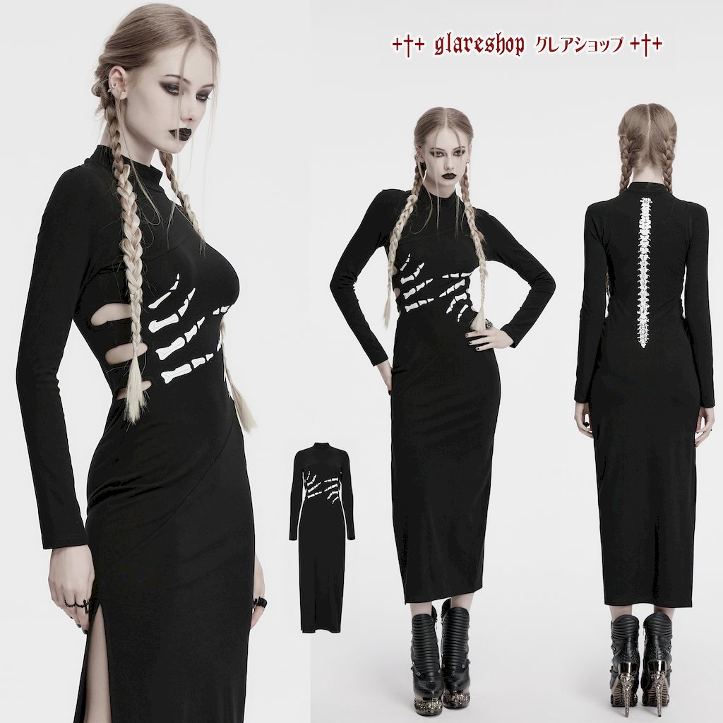 glareshop グレアショップ「S/L/2XL」WX940-B■ゴシックスケルトンプリントハイスリットロングドレス 黒 レディース | ヴィジュアル系 V系 モード系 コスプレ ステージ 衣装 服 [PUNK RAVE] Gothic Skeleton Printed High Slit Long Dress