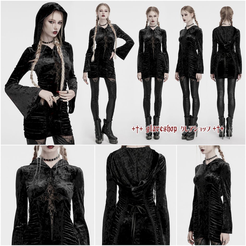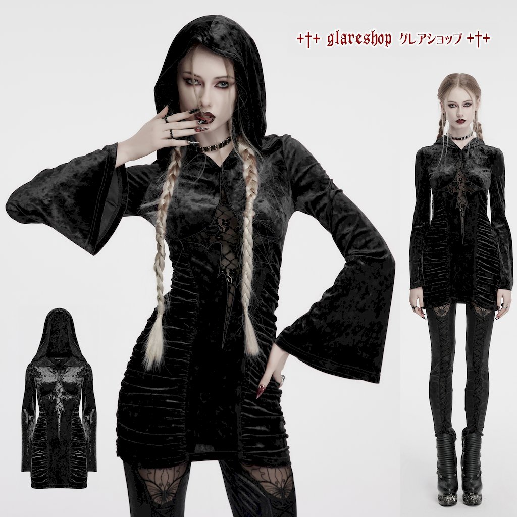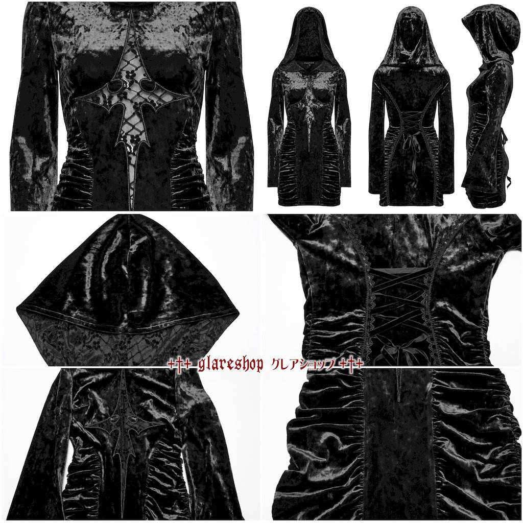 glareshopグレアショップ「S/L/2XL」WX946-B■ゴシックベルベットレースクロスフード付きボディコンドレス黒レディース|ヴィジュアル系V系ステージ衣装服[PUNKRAVE]GothicVelvetLaceCrossHoodedBodyconDress