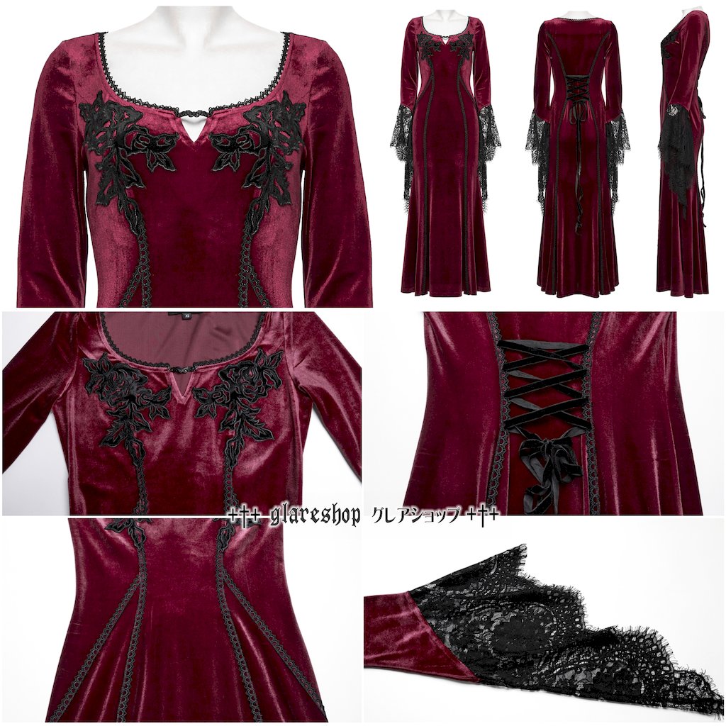 glareshopグレアショップ「S/L/2XL」WX948-R■ゴシックベルベットロングスリーブフィッシュテールマキシドレスレッドレディース|ヴィジュアル系V系モード系コスプレステージ衣装服[PUNKRAVE]GothicVelvetLongSleeveFishtailMaxiDress